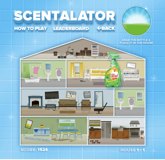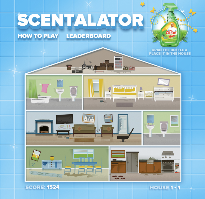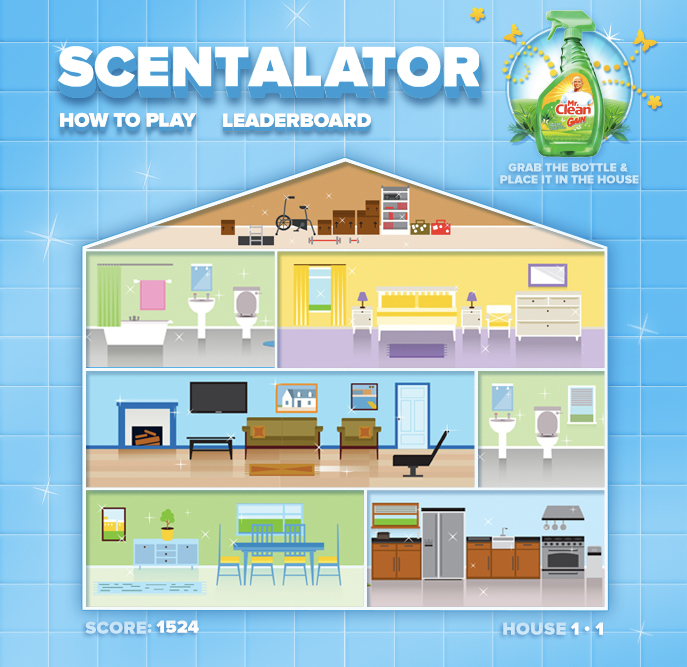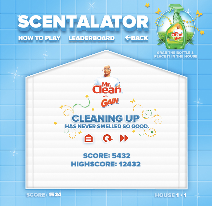 While working on the P&G account, I got the opportunity to concept and design a Mr. Clean online game announcing the combination of Mr. Clean with the scent of Gain. We called it the "Scenalator.".