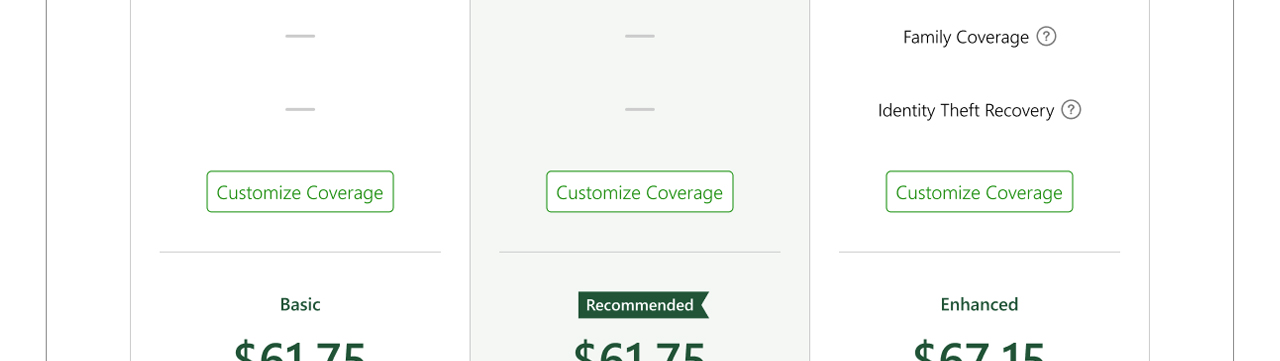 One way we solved this was by separating information into constructs that felt relatable. The three-offers page (Fig. 1) is a common pattern seen in e-commerce. Along with giving customers options, it also provided the opportunity to highlight their coverages and create a beachhead they could use to explore further, in this case by selecting a "Customize Coverage" option (Fig. 2).